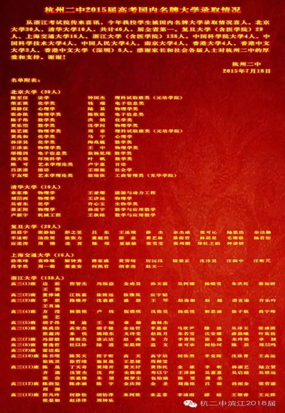 《中国浙江教育研究院玛林2015年7月21日讯》上周六,从杭二中公告栏得知,2015年的高考取得不俗的成绩,领先浙江中学界。最令人瞩目和羡慕的就是国内优秀大学的录取人数。具体如下: