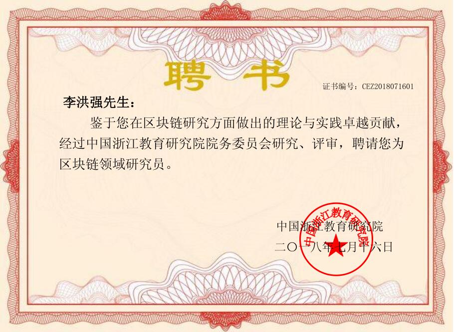 《中国浙江教育研究院杨桦2018年7月16日星期一讯)鉴于杭商理事会理事、杭州祥丰物流有限公司董事长李洪强先生在区块链研究方面做出的理论与实践卓越贡献,经过中国浙江教育研究院院务委员会研究、评审,聘请李洪强先生为区块链领域研究员。