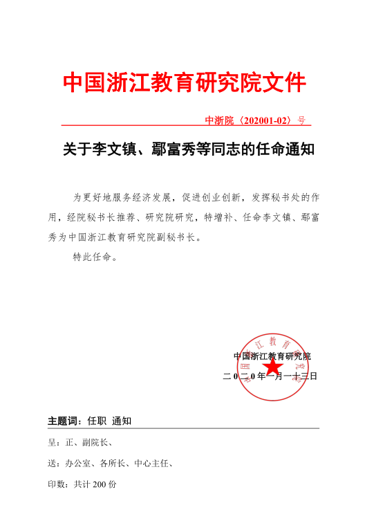 为更好地服务经济发展,促进创业创新,发挥秘书处的作用,经院秘书长推荐、研究院研究,特增补、任命李文镇、鄢富秀为中国浙江教育研究院副秘书长。