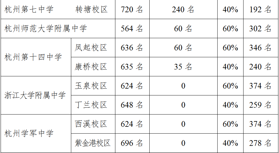 2022年共有15所学校(21个招生单位)招收名额分配生(以下简称分配生)。其中杭州高级中学贡院校区、杭州第二中学滨江校区、杭州第四中学下沙校区、杭州师范大学附属中学、杭州第十四中学凤起校区、浙江大学附属中学玉泉校区、杭州学军中学西溪校区、杭州市长河高级中学等学校(校区)的分配生招生名额,按2022年各学校(校区)除中外合作办学项目班及特色班等之外的市区招生计划数的60%确定;杭州高级中学钱江校区、杭州第二中学东河校区、杭州第四中学吴山校区、杭州第七中学转塘校区、杭州第十四中学康桥校区、浙江大学附属中学丁兰校区、杭州学军中学紫金港校区、杭州市源清中学、杭州学军中学海创园学校、杭州第二中学钱江学校、杭州高级中学钱塘学校、杭州第四中学江东学校、杭州绿城育华学校的分配生招生名额,按2022年各学校(校区)除中外合作办学项目班及特色班等之外的市区招生计划数的40%确定。按照上述规定,现将各学校(校区)2022年分配生招生名额公布如下。