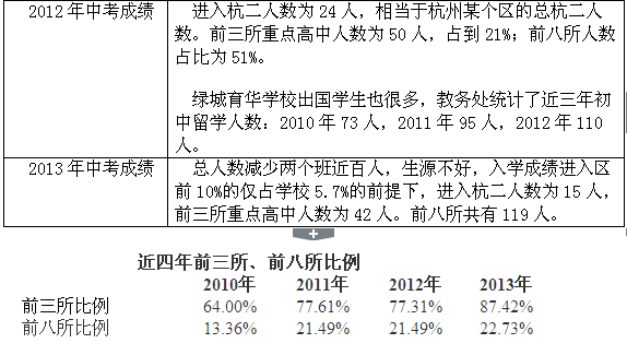 《中国浙江教育研究院李晓2015年11月06日讯》杭州绿城育华学校在整个杭州市教育行业里属于前列重点学校,在学生的升学成绩上表现不俗,现拿12、13年成绩分享如下: