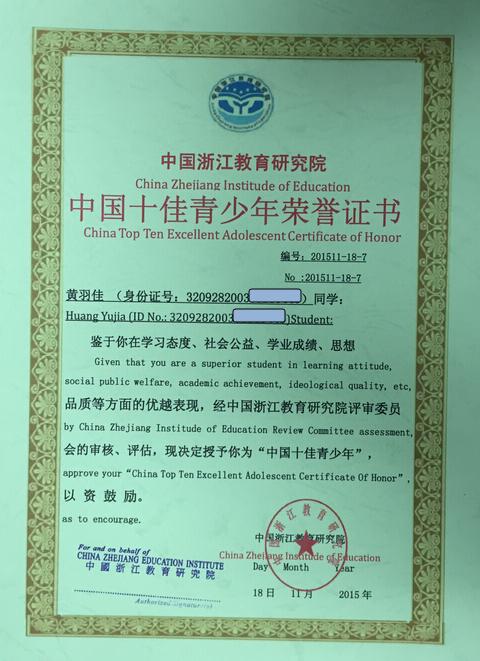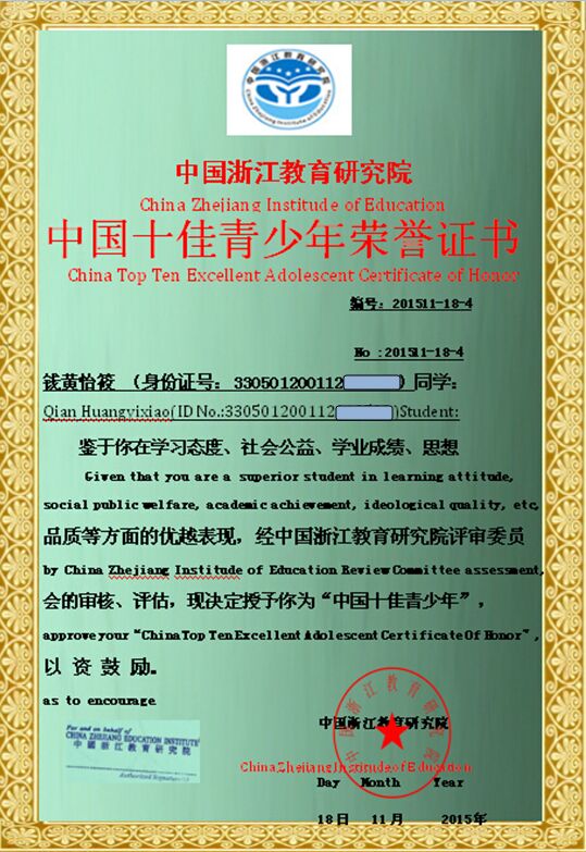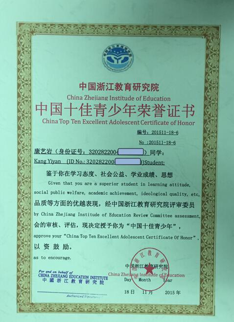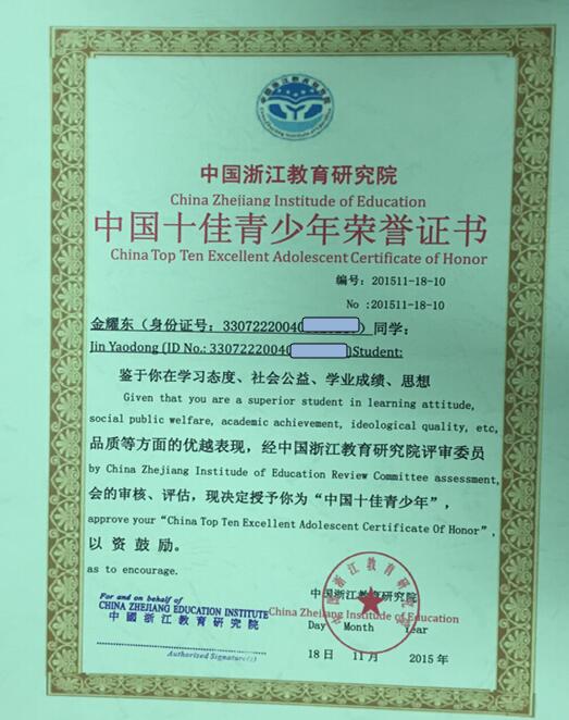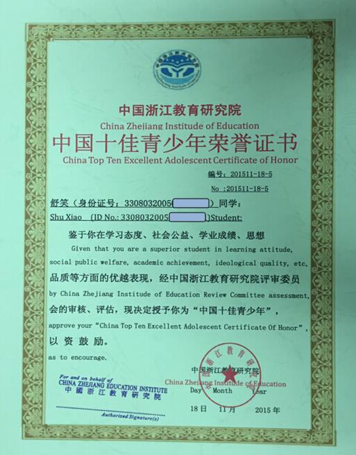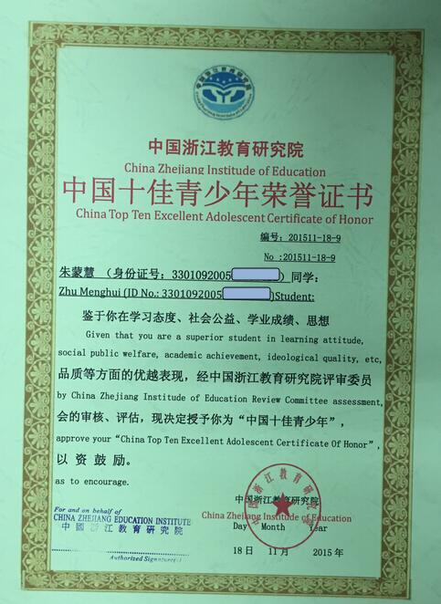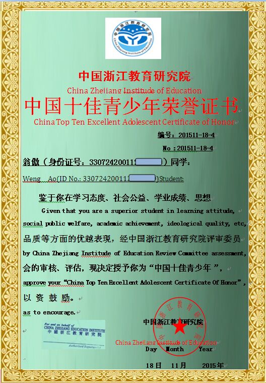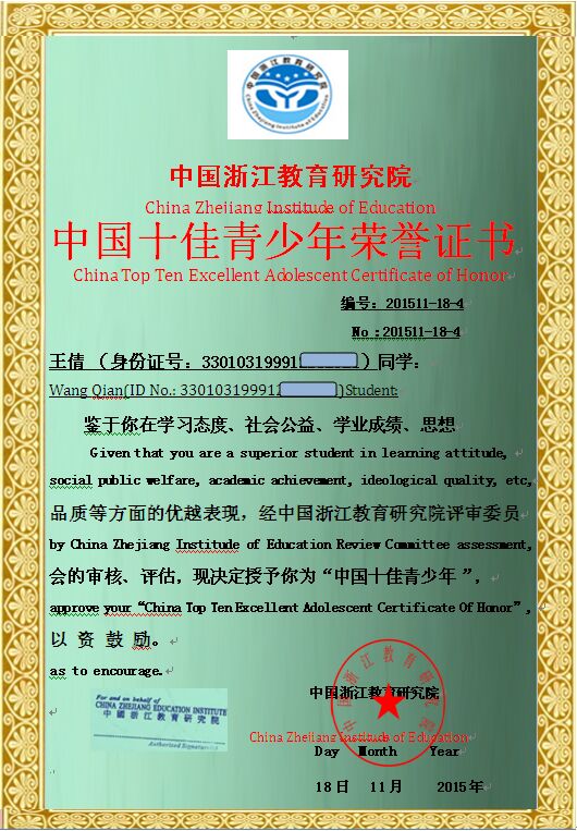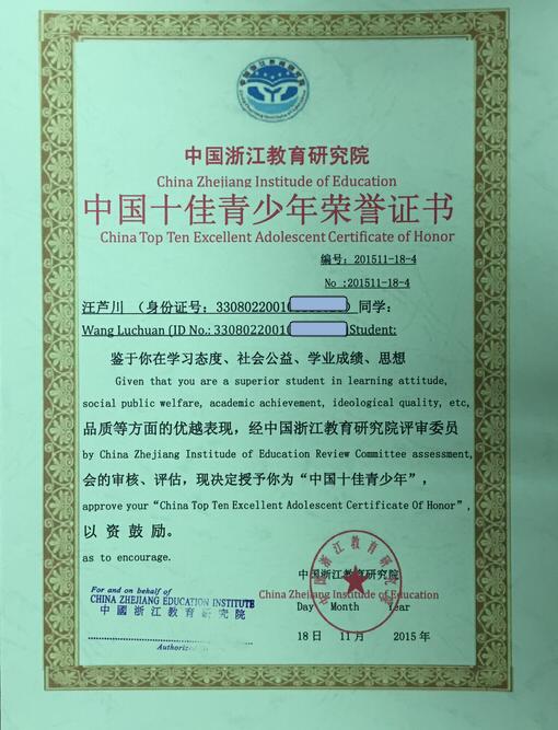 中国浙江教育研究院是基于中小学教育研究的专业机构,我院开展的2015年度“全国十佳青少年”评选活动,根据“德、智、体、美、劳”全面发展的原则,期间共收到418名中小学生推荐参赛,经过评委小组验证评审,以下学生获得“全国十佳青少年”荣誉称号: