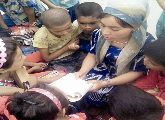 在学校,她自学了汉语、英语、土耳其语和维吾尔语,同时萌发了教家乡孩子学汉语的念头。2013年,她暑假回家,和两个新疆朋友一起办起了免费的“汉语公益课堂”。热孜宛古丽从基础教起,早上教汉语拼音、简单汉字,下午用汉语给大家讲故事。一传十、十传百,越来越多的孩子开始缠着父母要去听课。46天里,学生数量从开始的37人扩大到247人,教授内容也从汉语拼音、简单汉字、短语、句子增加到汉语对话。那个夏天,热孜宛古丽感动了村民,村民也感动了她。于是,2014年,2015年,她的“公益汉语课堂”每年暑期都会如期进行……